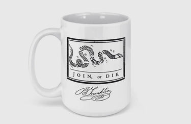 Our 15 oz. Join or Die Ceramic Mug features an authentic reproduction of the famous cartoon and accompanying article first published by Benjamin Franklin in the Pennsylvania Gazette on May 9, 1754.