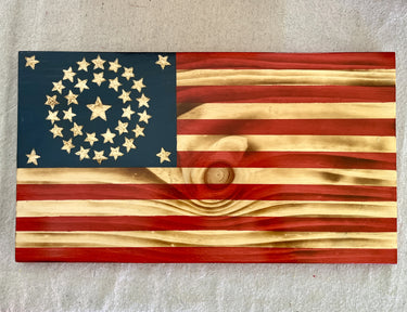 This wooden flag is hand crafted from individual pieces of pine. Hanging hardware installed on the back (Two sawtooth frame hangers on each side). Wood is burned to maximize grain and appearance. Appearance will differ from product photos based on the individual characteristics of each piece of wood, and burning pattern. There will be knots in the wood and imperfections which add to the vintage look of the flag.