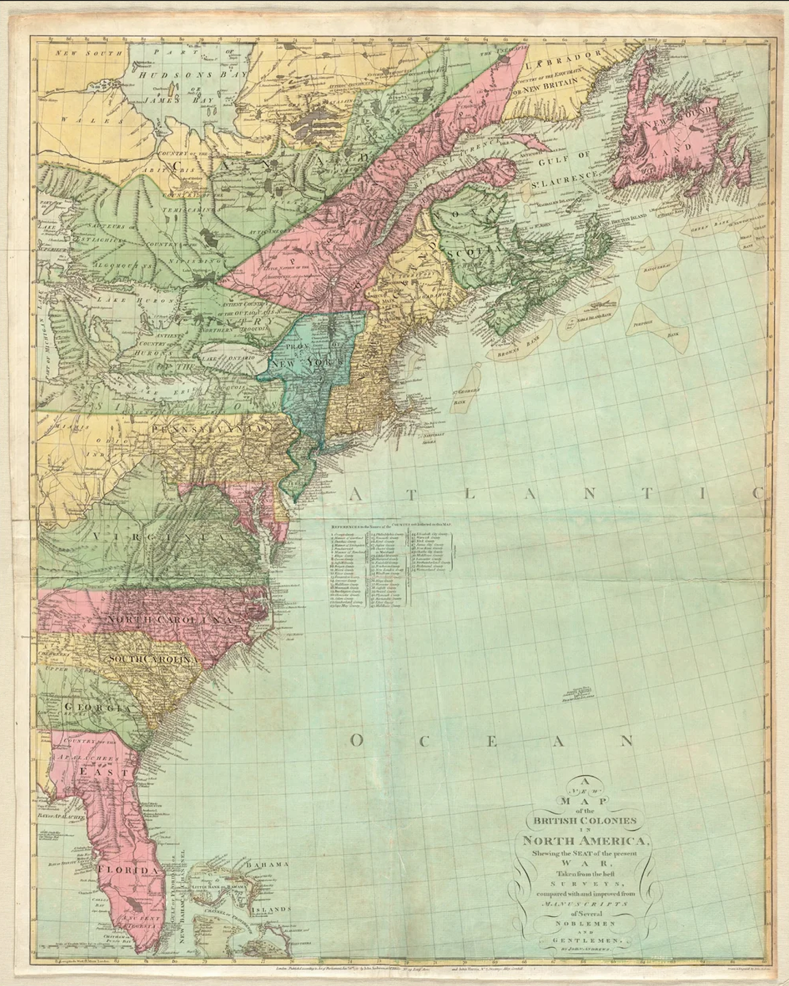 This detailed map—the work of cartographer John Andrews—was originally titled “A new map of the British colonies in North America, shewing the seat of the present war…” and was crafted to help readers follow the conflict unfolding across vast and varied landscapes.