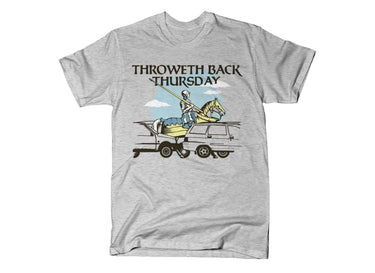 Add some medieval humor to your wardrobe with this playful “Throweth Back Thursday” design! Featuring a knight on horseback jousting with a modern SUV, this shirt is the perfect blend of history, wit, and casual style.
