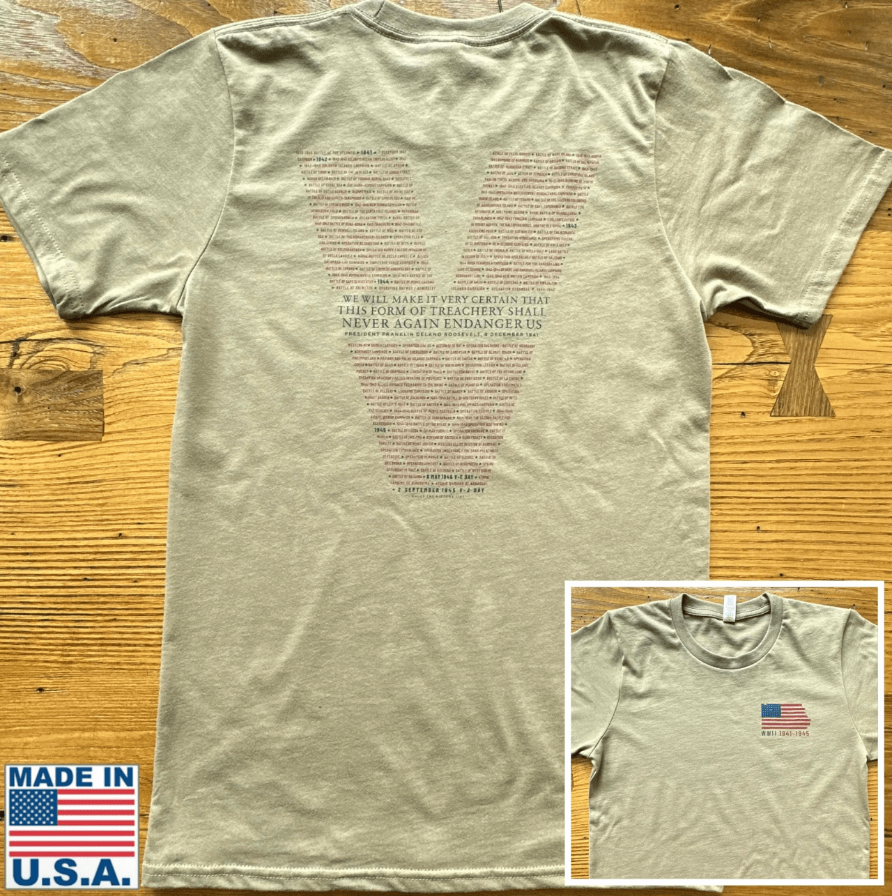 This design lists all of the battles in which the United States was involved, starting with the bombing of Pearl Harbor through to V-E Day and V-J day, and includes, prominently, this quote from FDR's address to Congress and the nation following the attack on Pearl Harbor: