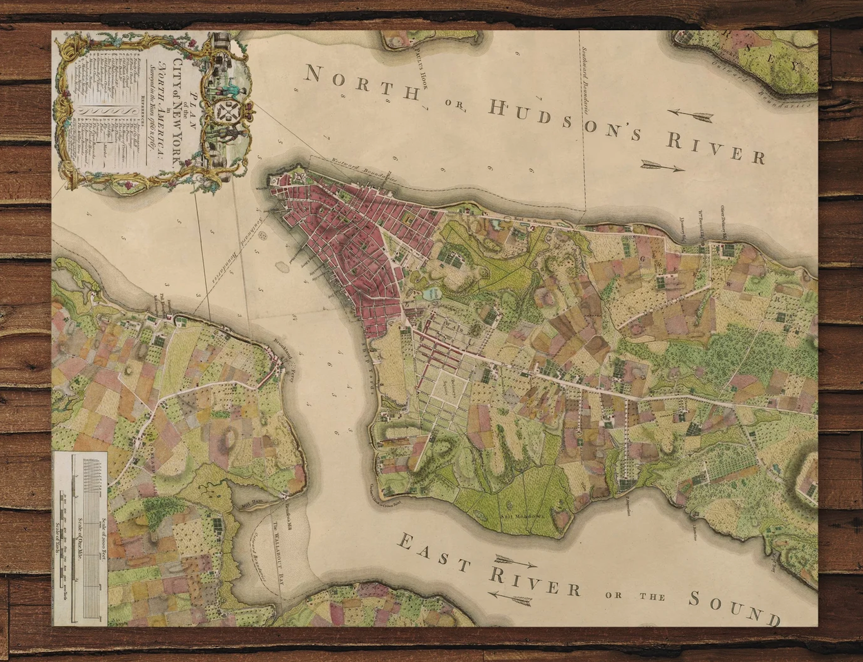 tep back into Revolutionary-era New York with this full-color cloth replica map from 1776, capturing lower Manhattan’s bustling port, midtown’s patchwork of farms, the small village of Brooklyn, and Paulus Hook—now known as Jersey City. Adapted from Bernard Ratzer’s renowned “Plan of the City of New York… surveyed in the Years 1766 & 1767,” this restored artifact offers a vivid glimpse into a city on the brink of the American Revolution.