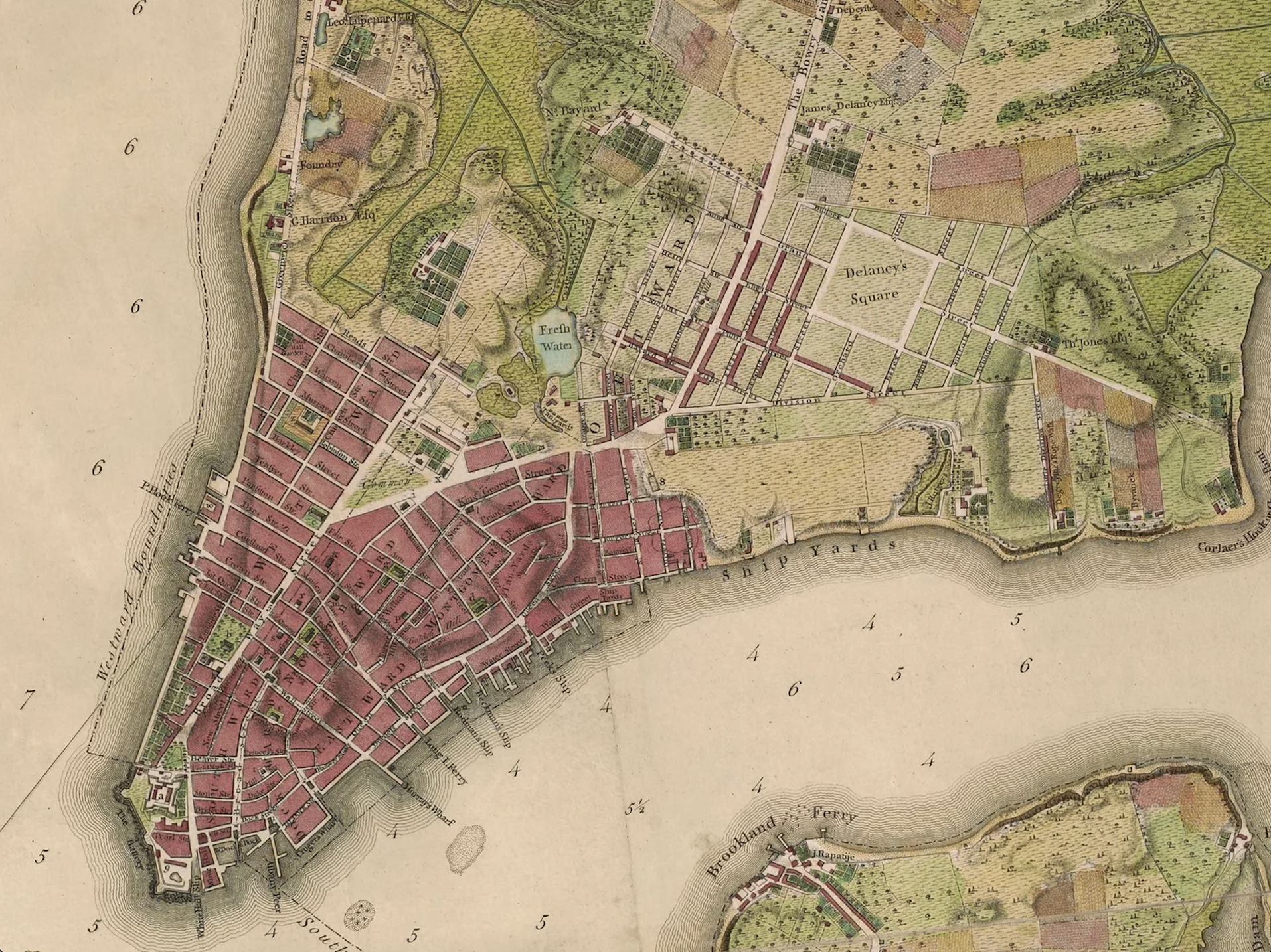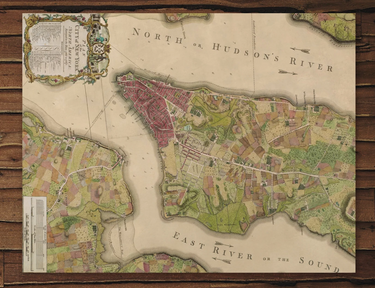 Full-color 1776 reproduction map of New York City and surrounding waterways