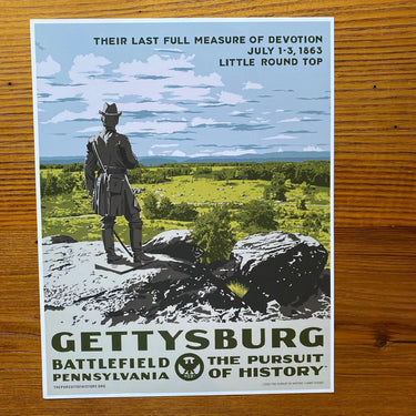 Capture the timeless spirit of one of America’s most hallowed grounds with this Gettysburg Battlefield art print. Inspired by the bold, iconic style of the 1930s Works Progress Administration (WPA) National Park posters, this design pays tribute to the valor and sacrifice that defined the Battle of Gettysburg.