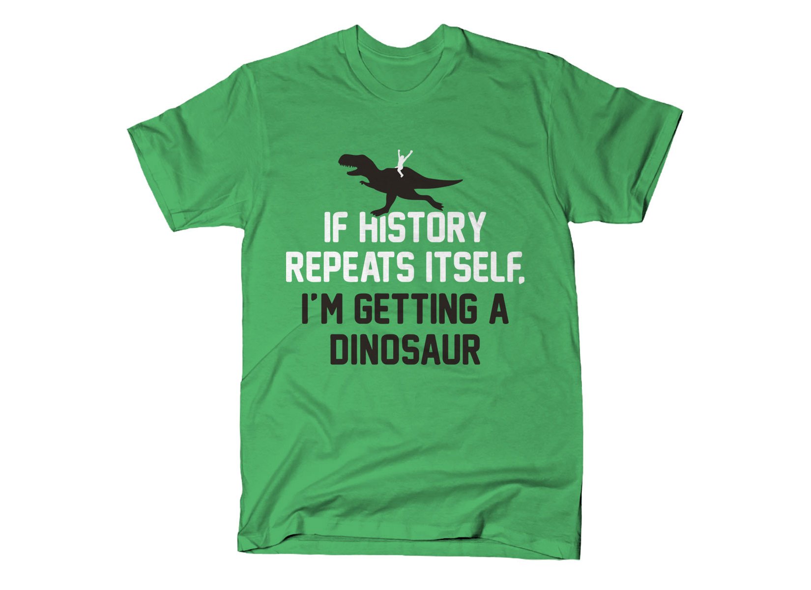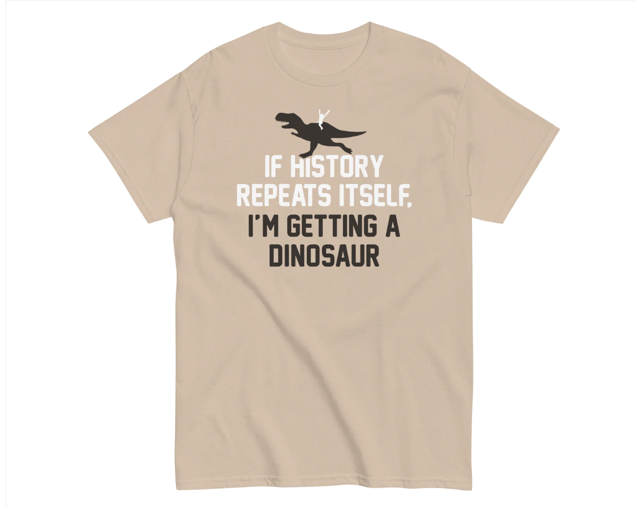 Dinosaurs may have disappeared 65 million years ago, but who wouldn’t want one if they made a comeback? This playful green tee declares “If history repeats itself, I’m getting a dinosaur”—perfect for history buffs, science fans, and anyone who appreciates a witty twist on the past.