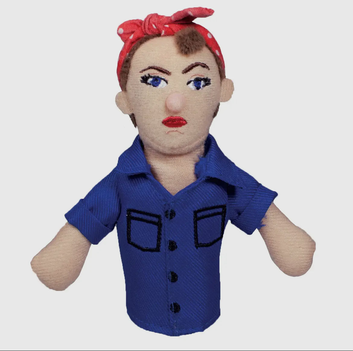 "the great arsenal of democracy." Since WWII, Rosie's inspired us all to roll up our sleeves and show those doubters a thing or two. She'll stick by you - in a lunch pail, on the ice box, or in your locker at the machine shop. Let Rosie remind you every day: "We Can Do It!" On your finger, she's a puppet; on your fridge, she's a magnet, approx. 4" tall.