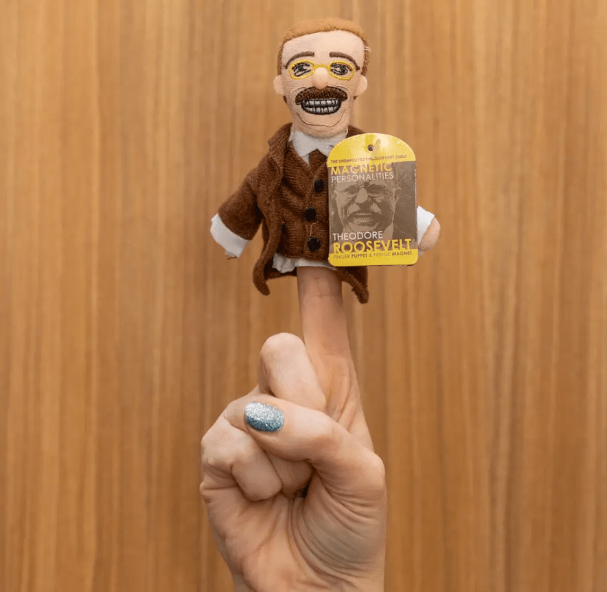 Rough Rider, author, conservationist, president, and now a finger puppet! It's Theodore Roosevelt. On your finger, he's a puppet; on your fridge, he's a magnet; in your puppet collection he's a true American hero!